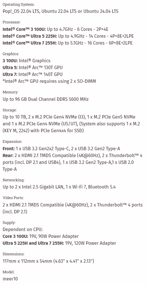 Model terbaru Meerkat membawa peningkatan signifikan dari sisi performa dan efisiensi daya, menjadikannya solusi ideal untuk pengguna Linux yang mencari desktop mungil namun mumpuni. Perangkat ini hadir dalam dua ukuran sasis berbeda (39 mm dan 52 mm tinggi), dengan fleksibilitas konfigurasi yang luas.