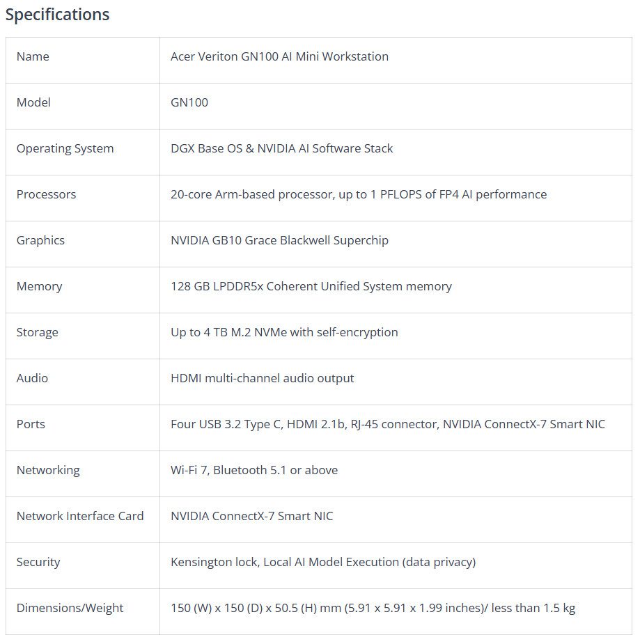 Veriton GN100 dibangun di atas NVIDIA GB10 Grace Blackwell Superchip, sebuah chipset generasi baru yang mampu mencapai hingga 1 PFLOPS performa AI (FP4). Perangkat ini menggabungkan: