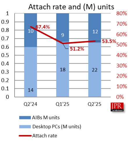 Selain pasar GPU, laporan ini juga menyinggung kondisi CPU desktop. Pengiriman CPU tercatat meningkat 21,6% secara kuartalan, meskipun masih menurun 4,4% dibanding tahun lalu. Sementara itu, tingkat attach rate AIB—yakni persentase PC desktop yang dipasangi GPU diskrit—ikut naik menjadi 154%, bertambah 2,3% dibanding kuartal sebelumnya.