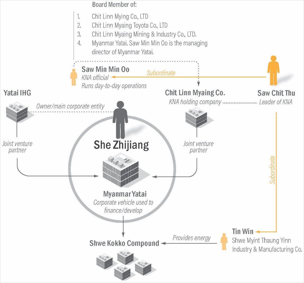 - Saw Min Min Oo – pejabat KNA yang mengelola perusahaan terkait scam.