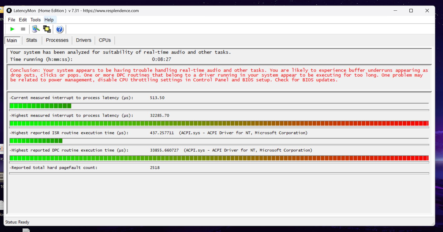 Menggunakan LatencyMon, peneliti menemukan bahwa pada laptop seperti ASUS ROG Zephyrus M16, core pertama CPU menghabiskan lebih dari 90 detik untuk memproses interrupt. Selama periode itu, core terblokir dari tugas lain, sehingga menimbulkan stuttering pada beban kerja sensitif waktu.