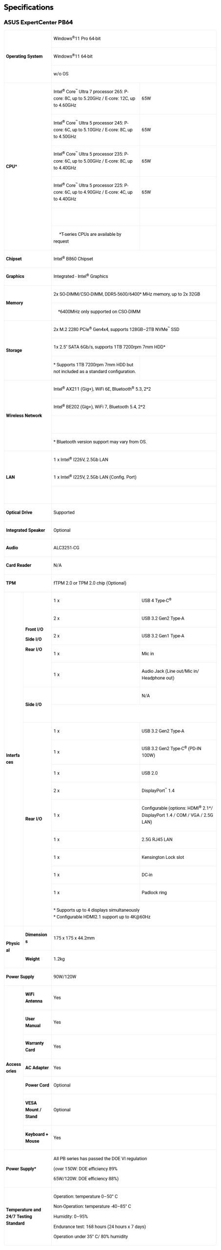 Dengan dimensi 175 x 175 x 44,2 mm, ExpertCenter PB64 hadir dalam pilihan warna hitam klasik dan putih elegan. Ukurannya yang mungil membuatnya ideal untuk ruang kantor, rumah sakit, ritel, maupun penggunaan signage digital dan kios.