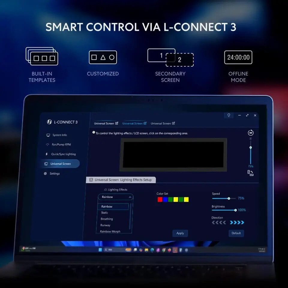 Layar ini juga dilengkapi cincin ARGB lighting dengan difusi lembut yang mengelilingi panel. Semua efek pencahayaan serta konten layar dapat dikontrol penuh melalui software L-Connect 3, termasuk unggahan video, gambar, mode tampilan animasi, serta sinkronisasi pola pencahayaan dengan perangkat lain dalam sistem.