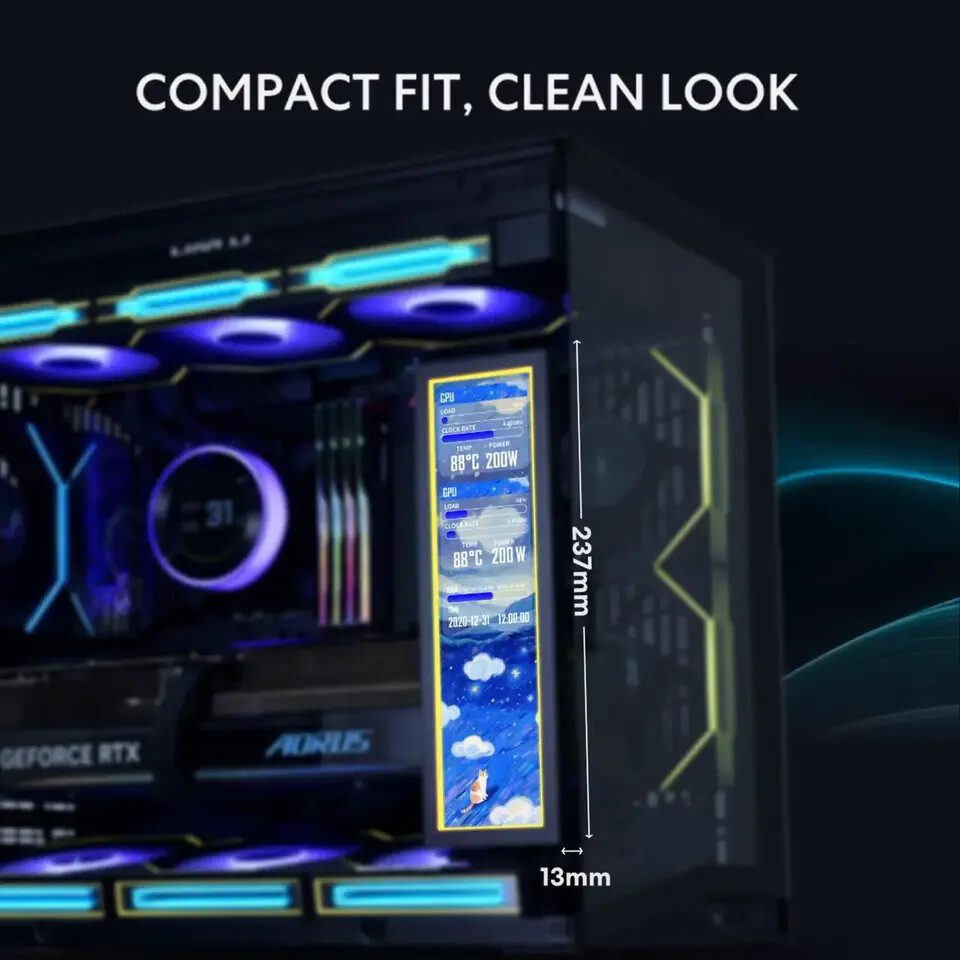 Layar ini menggunakan panel IPS 1920×480 dengan refresh rate 60 Hz dan tingkat kecerahan hingga 500 nits, menghasilkan tampilan tajam dan responsif. Ditenagai melalui USB, layar dapat terhubung lewat header motherboard 9-pin atau koneksi USB Type-A ekstensi, sehingga mudah digunakan dengan konsep plug-and-play.