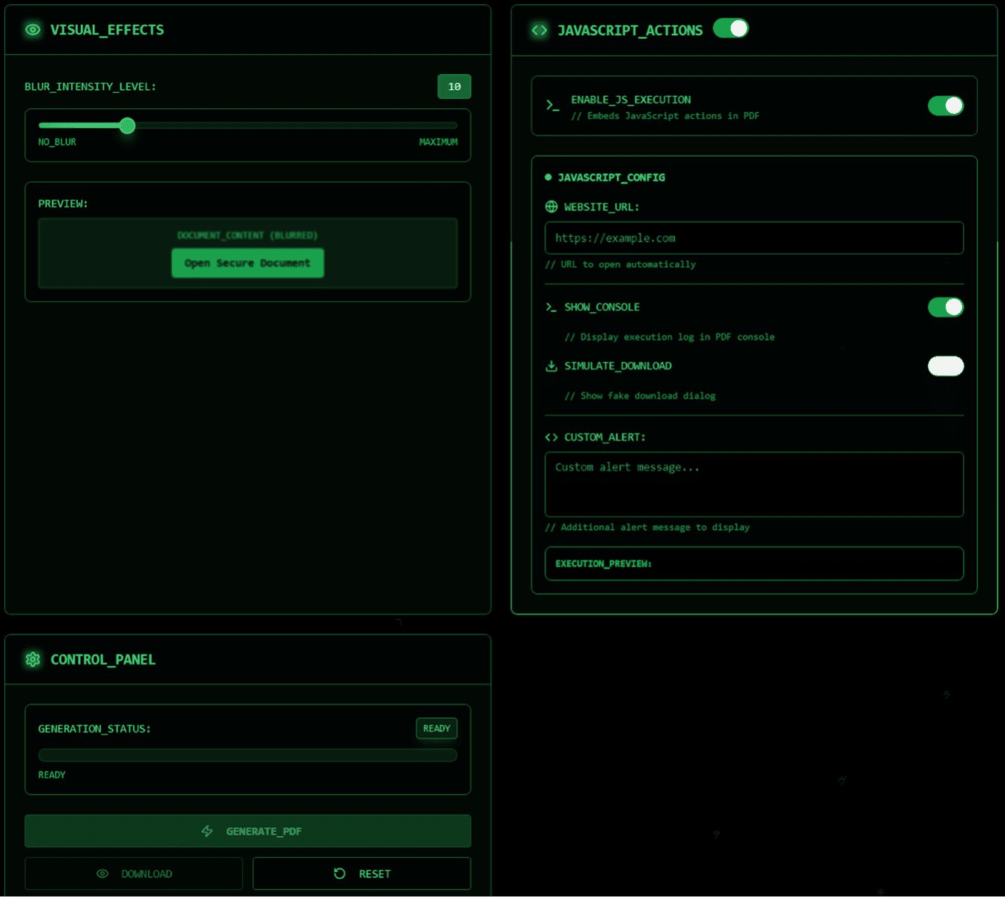 MatrixPDF memungkinkan penyerang mengunggah file PDF asli sebagai umpan, lalu menambahkan fitur berbahaya, antara lain: