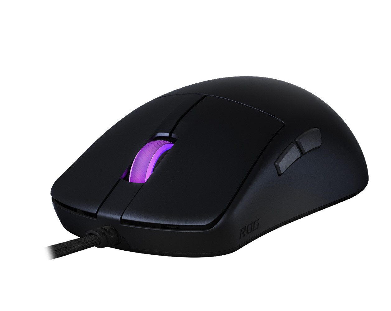 Logo ROG di bagian atas memiliki iluminasi berwarna merah, sementara roda gulir dilengkapi efek RGB lighting. Tombol pengaturan dpi ditempatkan di bagian bawah mouse.