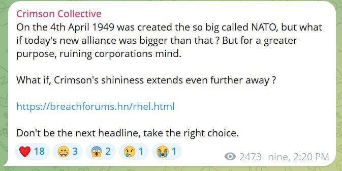Tidak lama kemudian, Crimson mengumumkan aliansi dengan ShinyHunters melalui kanal Telegram mereka:
