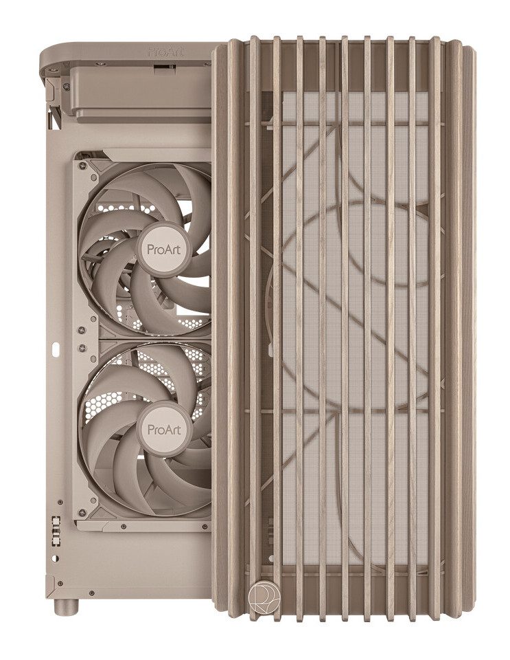ASUS juga memperhatikan detail visual dengan menghadirkan teknik pencocokan warna tingkat tinggi. Pada PA401 Beige, bahkan baling-baling kipas depan berdiameter 160 mm memiliki warna senada dengan sasis — dicetak langsung melalui injection molding agar konsistensi warna sempurna di seluruh komponen.