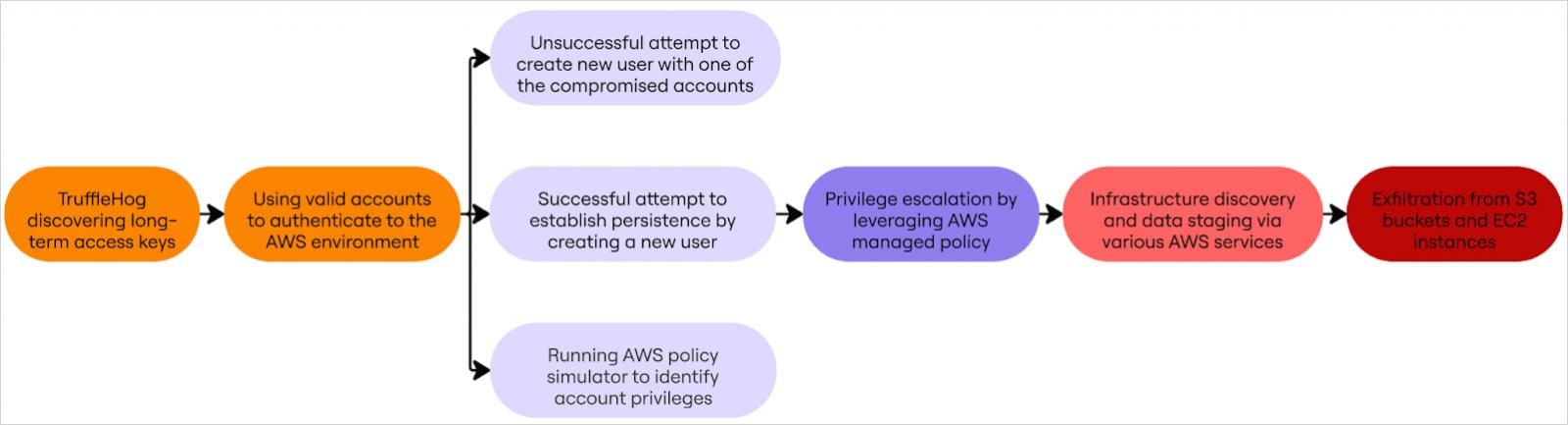 - Mereka memanfaatkan TruffleHog, alat open-source yang dirancang untuk menemukan kunci akses AWS (Access Key) yang terekspos di repositori publik.