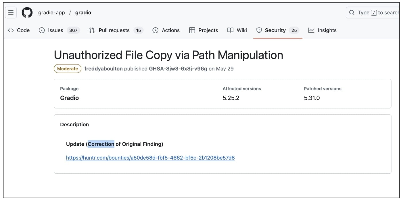 - Gradio (gradio-app/gradio) — celah penyalinan file arbitrer dan Denial of Service melalui mekanisme flagging. Dilaporkan pada 16 Januari 2025 dan diberi ID CVE-2025-48889.