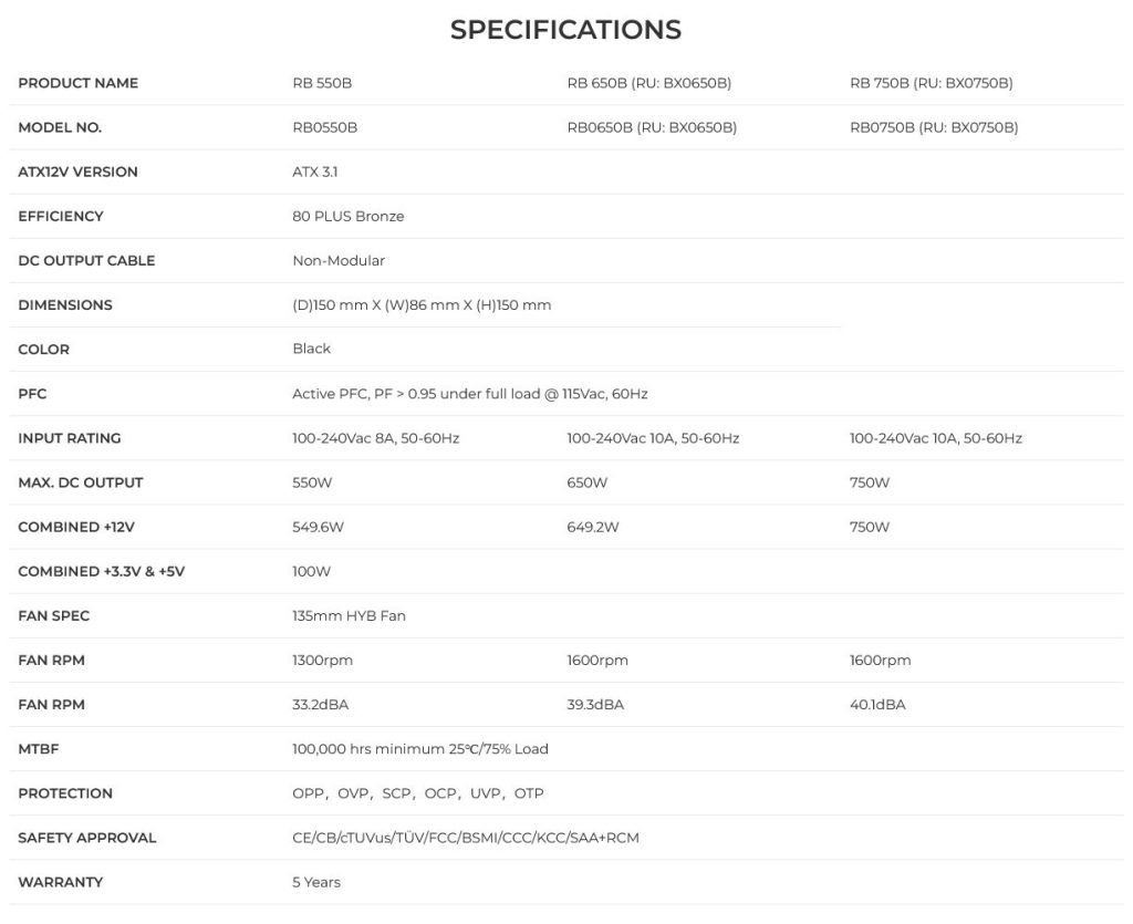 Seri RB hadir dalam tiga varian daya: 550 W, 650 W, dan 750 W, dengan efisiensi hingga 85% serta kepatuhan penuh terhadap spesifikasi Intel ATX 3.1 — memastikan kompatibilitas optimal untuk sistem generasi saat ini maupun mendatang.