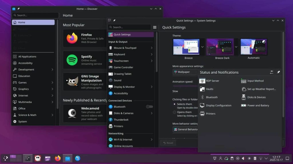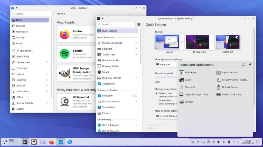 - Discover (App Store KDE) lebih cepat diluncurkan, mendukung flatpak+https:// URLs, dan kini bisa menampilkan driver hardware yang tersedia.