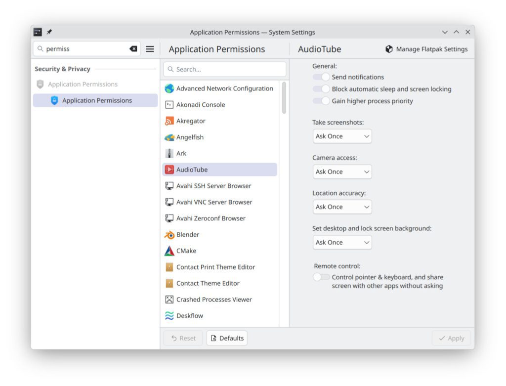 Fitur baru untuk mengontrol izin aplikasi, termasuk akses screenshot, remote control, hingga izin komunikasi jaringan — menggantikan halaman lama Flatpak Permissions.