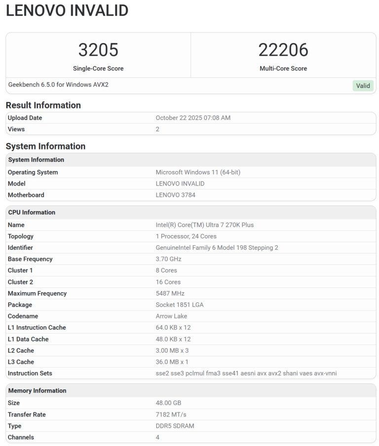 Hasil pengujian menunjukkan bahwa prosesor ini berjalan pada kecepatan dasar 3,7 GHz dan boost clock hingga 5,5 GHz, sama dengan 265K, serta diuji menggunakan sistem yang dipasangkan dengan GPU NVIDIA GeForce RTX 5090D, mengindikasikan bahwa pengujian dilakukan pada sistem desktop Lenovo terbaru di Tiongkok.