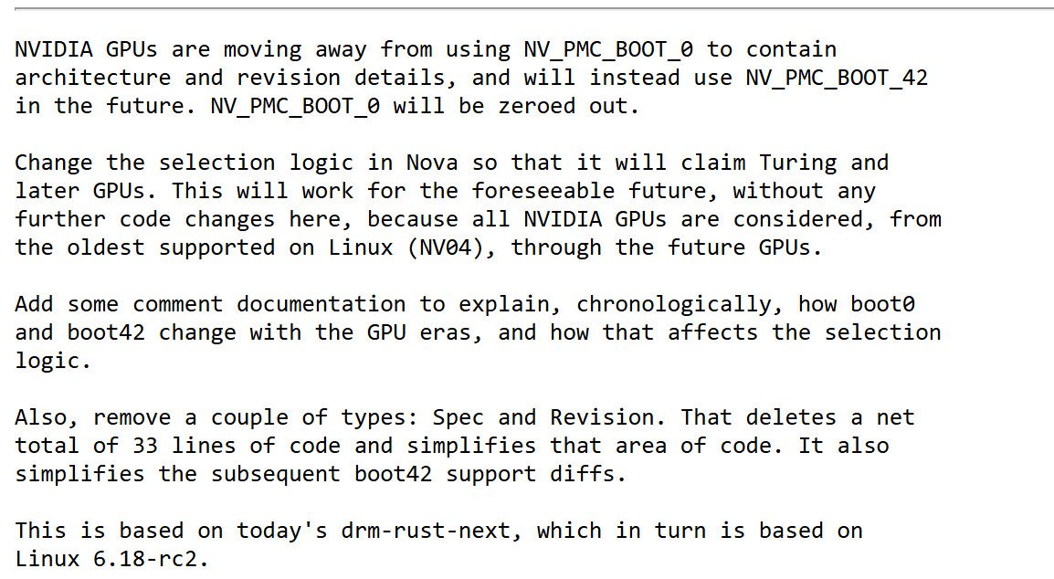 Pembaruan ini pertama kali muncul di milis publik pada akhir pekan lalu melalui NVIDIA engineer John Hubbard, yang menjelaskan bahwa metadata arsitektur dan revisi GPU akan berpindah dari register lama NV_PMC_BOOT_0 ke NV_PMC_BOOT_42.