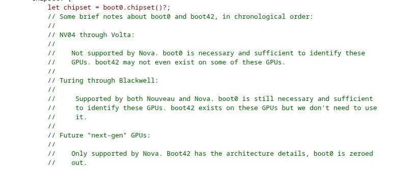 Menurut catatan pengembang, semua GPU dari Turing hingga Blackwell masih akan menggunakan sistem lama (BOOT_0), sementara generasi Rubin dan seterusnya akan sepenuhnya beralih ke register baru (BOOT_42).
