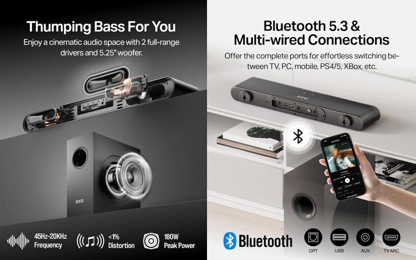 Soundbar ini mengusung dual racetrack full-range driver yang bekerja sama dengan subwoofer MDF 5,25 inci, menghadirkan:
