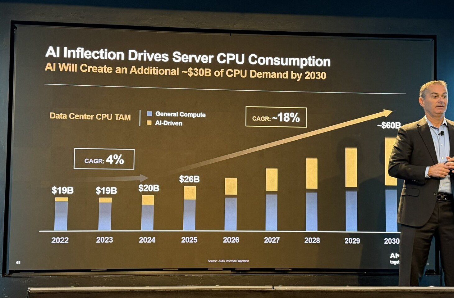 Menurut AMD, titik infleksi AI akan menambah USD 30 miliar pendapatan baru khusus untuk CPU pada tahun 2030. Angka ini akan berlapis di atas permintaan CPU server reguler yang saat ini bernilai sekitar USD 30 miliar, menghasilkan total pasar USD 60 miliar pada 2030 hanya untuk CPU.