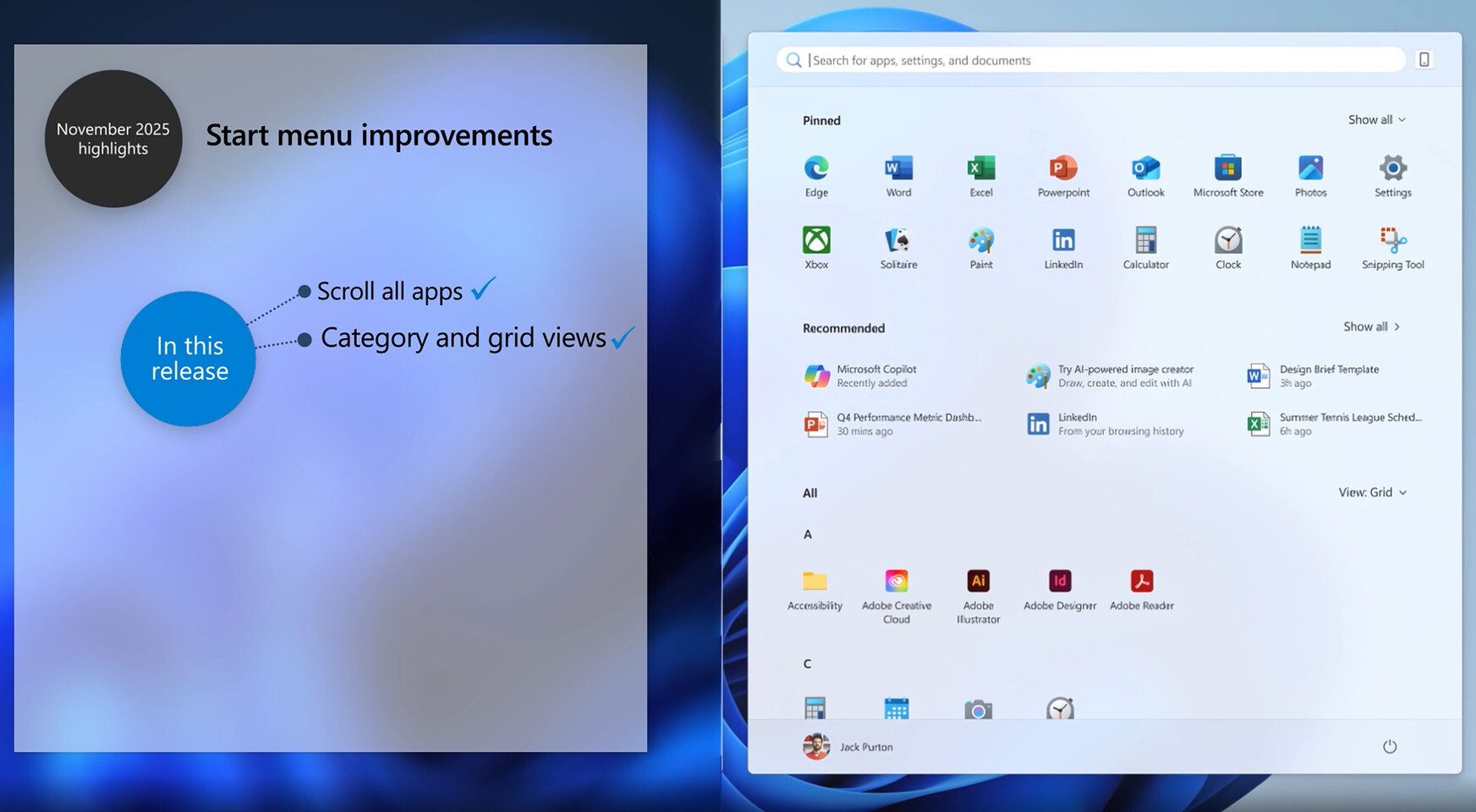 Start Menu kini tampil lebih fleksibel berkat fitur adaptive sizing, yang memungkinkan antarmuka menyesuaikan ukuran berdasarkan dimensi monitor untuk tampilan lebih seimbang. Microsoft juga menambahkan lebih banyak opsi kustomisasi: