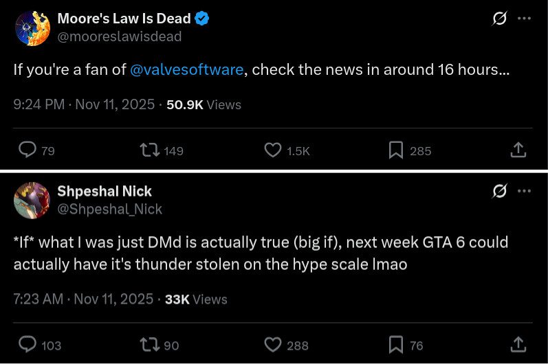 Leaker lain, Moore’s Law Is Dead, menyebut bahwa Valve tengah menyiapkan pengumuman besar yang diperkirakan akan terjadi “sekitar 16 jam” setelah bocoran tersebut diposting. Jika tepat, pengumuman itu jatuh sekitar tengah hari waktu EST pada 12 November.