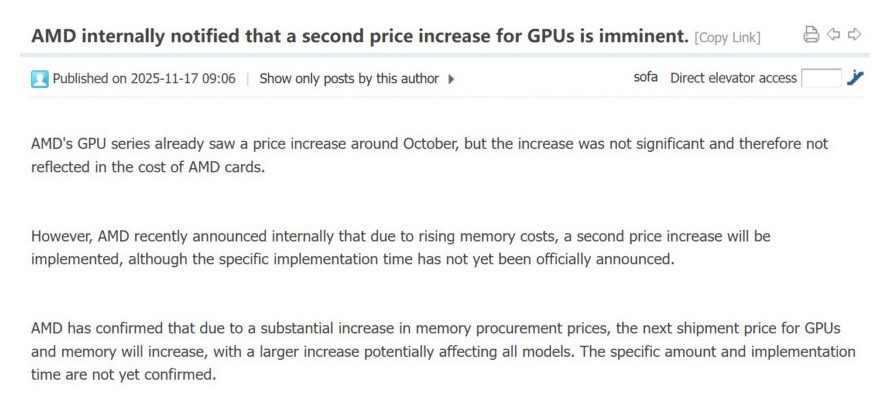 AMD dilaporkan bersiap melakukan kenaikan harga pada lini GPU mereka, menyusul meningkatnya biaya memori yang terus menekan produsen perangkat keras. Informasi dari forum Board Channels di Tiongkok menyebutkan bahwa AMD telah memberi tahu para mitranya bahwa kenaikan harga memori sudah cukup signifikan sehingga gelombang GPU berikutnya akan dipasarkan dengan harga lebih tinggi.