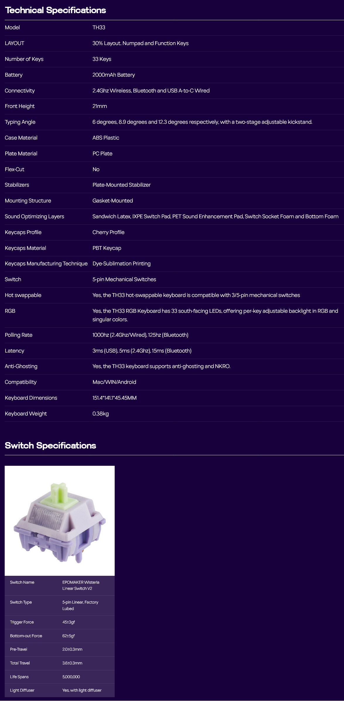 Dukungan VIA programmability memungkinkan pengguna memetakan makro dan pintasan sesuai kebutuhan—mulai dari otomatisasi spreadsheet hingga kontrol cepat dalam permainan. TH33 juga mendukung konektivitas triple-mode (Bluetooth 5.0, 2.4 GHz, dan kabel), serta dibekali baterai 2000 mAh untuk penggunaan seharian tanpa hambatan.