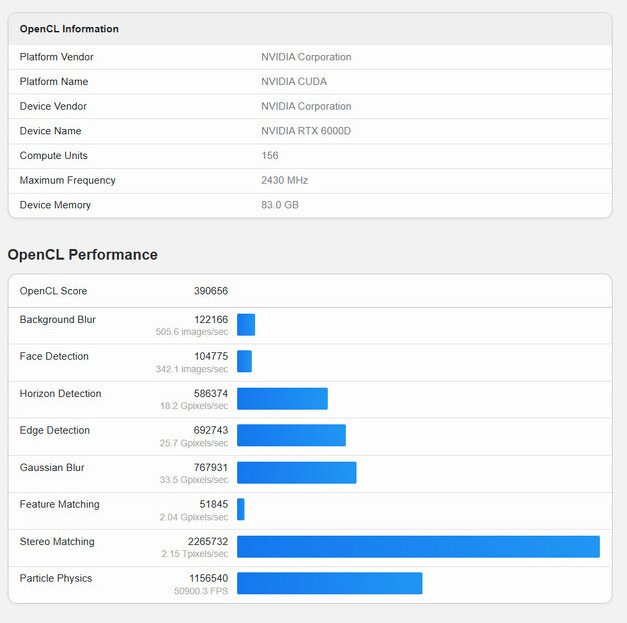 Pengujian Geekbench menunjukkan bahwa GPU ini mencapai skor 390.656 poin dalam OpenCL pada sistem Linux berbasis Rocky Linux 9.4, dipadukan dengan prosesor AMD EPYC 9654. Sistem pengujian teridentifikasi sebagai AIC CB502-NM, yang kemungkinan merupakan workstation atau server evaluasi.