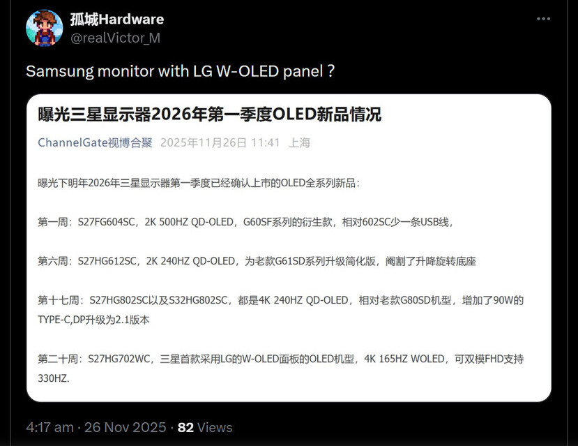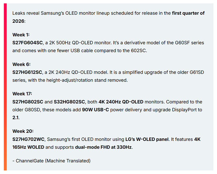 Bocoran yang sama juga menyebut Samsung tengah menyiapkan jajaran baru monitor QD-OLED, sebagian besar merupakan penyegaran dari lini Odyssey G60/61 serta G80/81, yang dijadwalkan meluncur sepanjang paruh pertama 2026.
