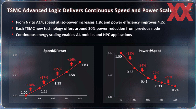 TSMC juga memaparkan data performa jangka panjang: transisi dari N7 ke A14 pada daya konstan menghasilkan peningkatan performa sekitar 1,8×, serta peningkatan efisiensi total mencapai 4,2×. Untuk A16, TSMC memperkirakan peningkatan 8–10% dalam kecepatan clock dibanding N2P pada voltase yang sama, dengan pengurangan konsumsi energi 15–20% pada throughput setara.