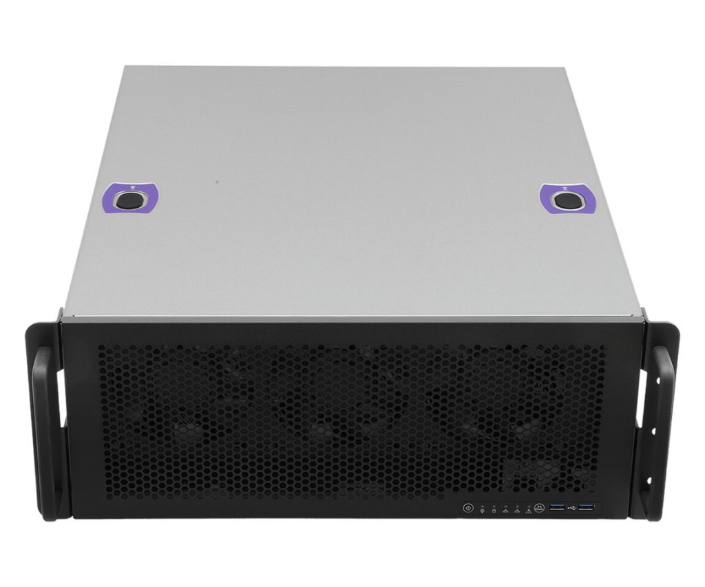 Panel depan dilengkapi tombol power dan reset, indikator LED untuk status daya, LAN1/LAN2, kegagalan sistem, serta HDD. Tersedia juga dua port USB 3.2 Gen 1 Type-A. Untuk penyimpanan internal, workstation ini menyediakan dua slot drive 2.5 inci, satu slot M.2 M-key (PCIe 5.0 x4) mendukung ukuran 22110/2280/2260, serta satu slot M.2 M-key (PCIe 4.0 x4) mendukung ukuran 2280/2260.