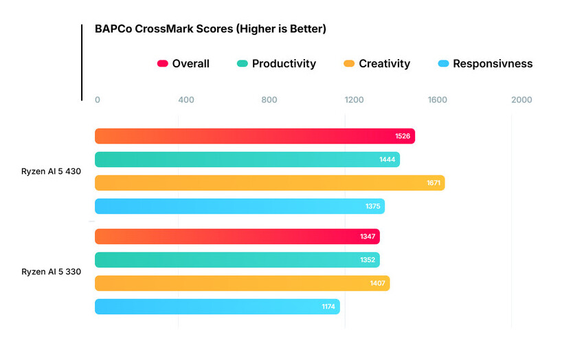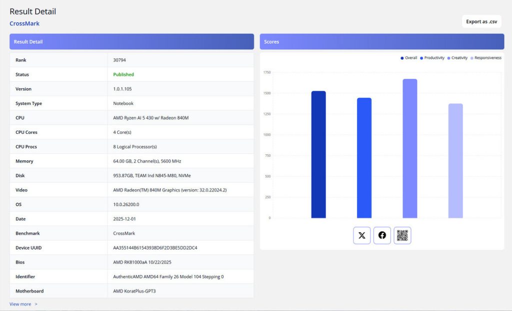 Detail mengenai prosesor AMD Ryzen AI 5 430 yang belum dirilis muncul di database BAPCo CrossBench, memperlihatkan sampel awal berjalan di platform referensi KoratPlus-GPT3 dengan memori dual-channel 64 GB (5600 MHz).