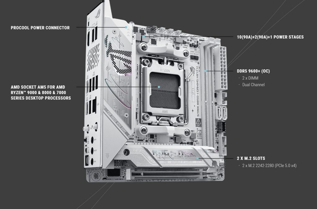 - Desain: versi putih elegan, spin-off dari Strix B850-I Gaming WiFi7.