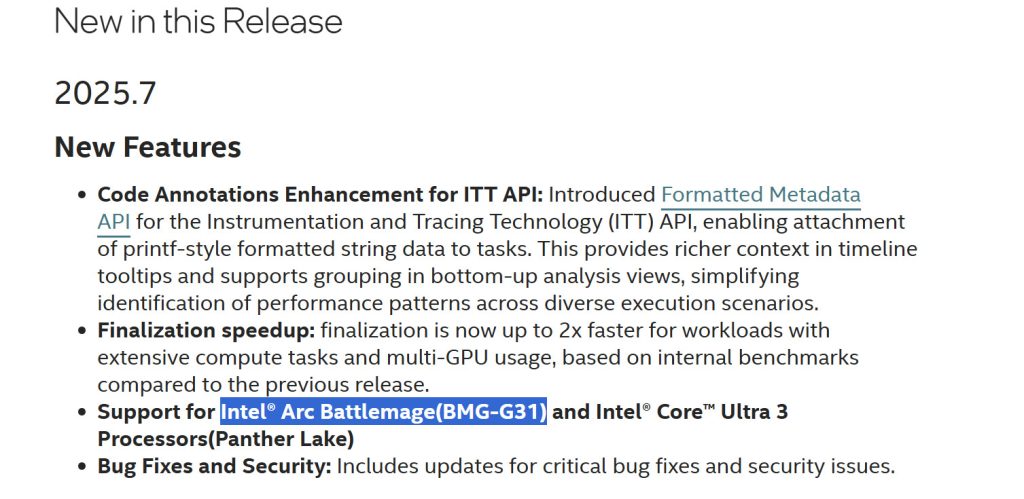 - VTune entry: mencantumkan dukungan untuk BMG-G31 GPU dan Intel Core Ultra 3 “Panther Lake”.