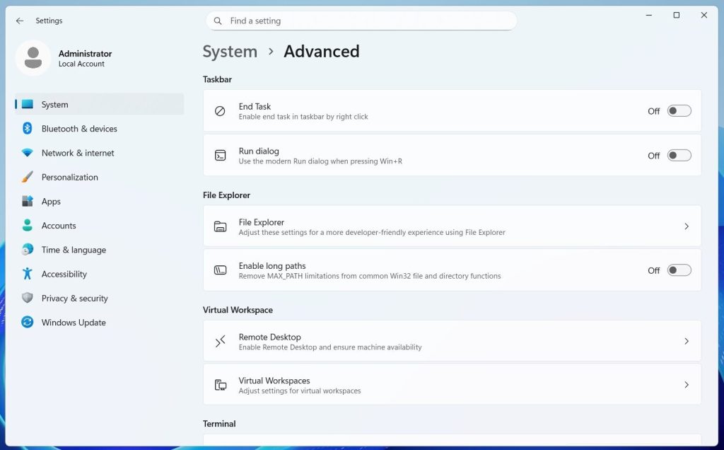 - Toggle opsional: tersedia di Settings > System > Advanced settings, default dalam keadaan nonaktif.