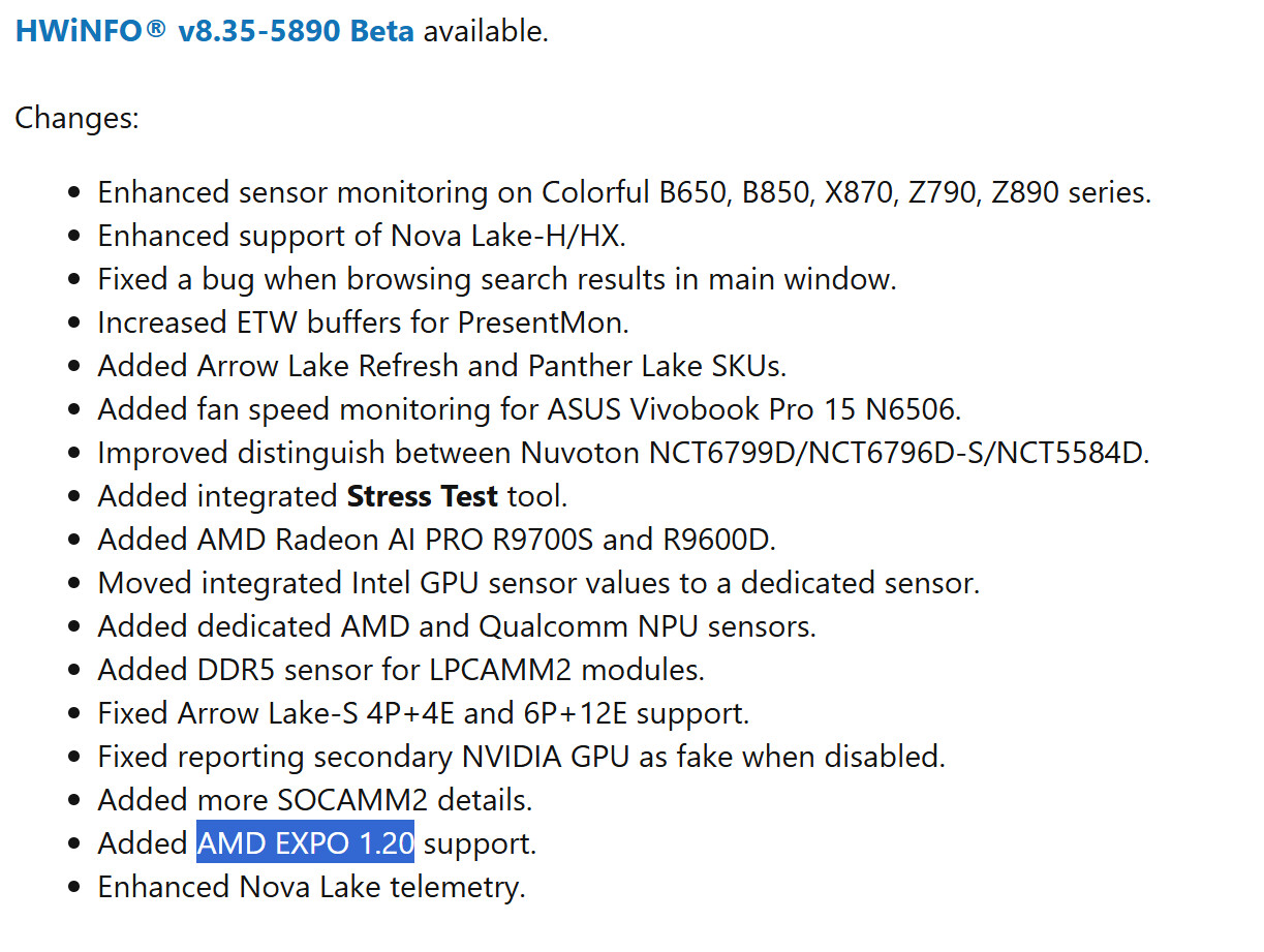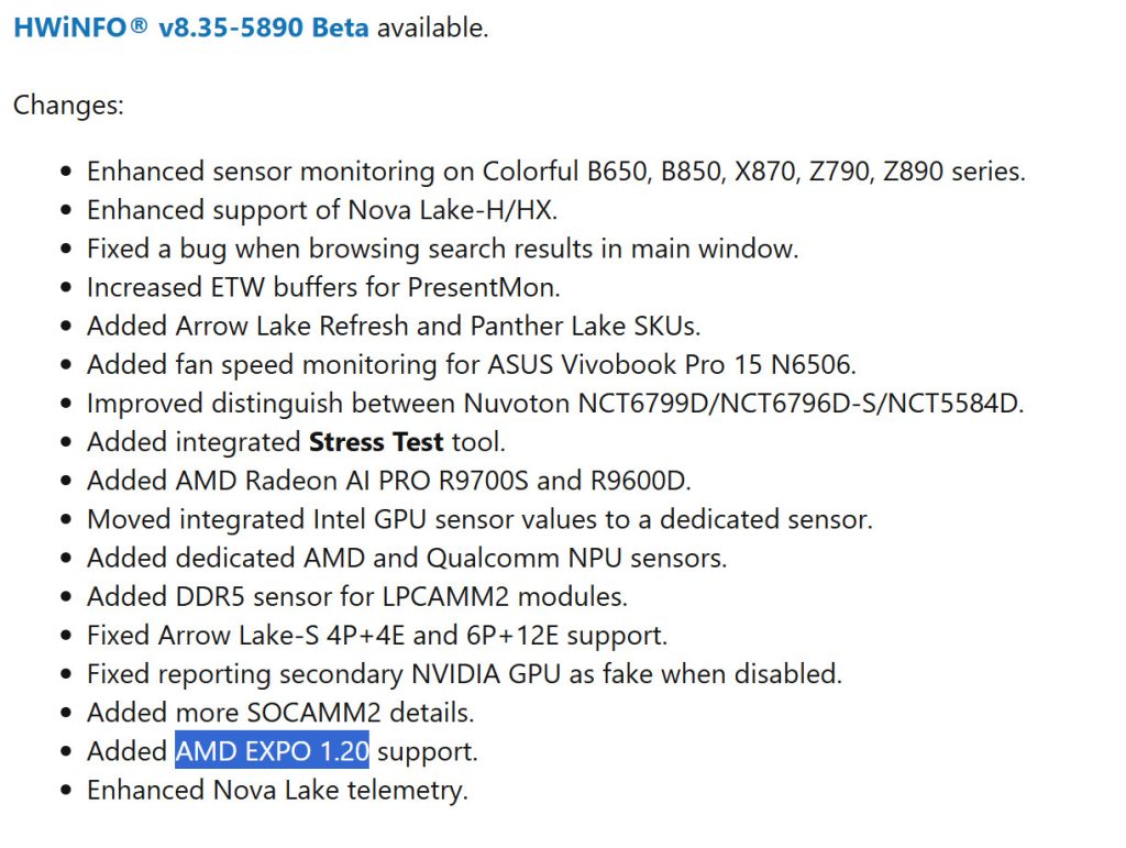 AMD dikabarkan tengah menyiapkan pembaruan penting untuk teknologi Extended Profiles for Overclocking (EXPO) melalui versi EXPO 1.2. Indikasi ini muncul setelah HWiNFO v8.35-5890 Beta menambahkan dukungan untuk EXPO 1.2, meskipun AMD sendiri belum mengumumkannya secara resmi.