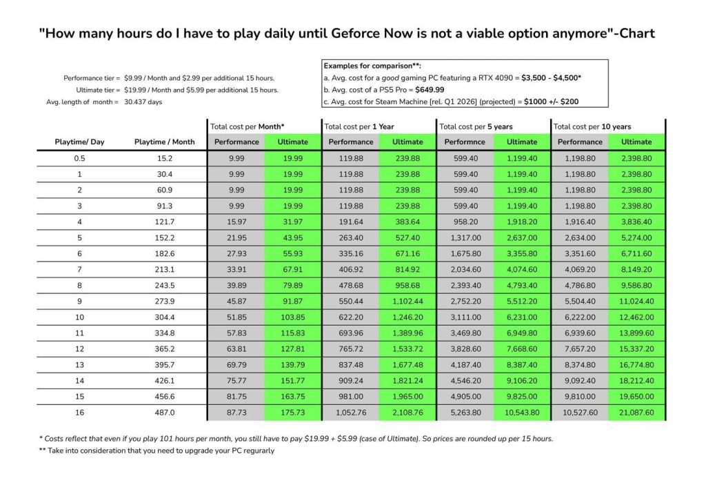 Sebagai gambaran, bermain sekitar tiga jam per hari atau kurang lebih 91 jam per bulan masih berada dalam batas langganan dasar. Namun, jika durasi bermain meningkat menjadi empat jam per hari atau sekitar 122 jam per bulan, pengguna paket Performance harus menambah biaya sekitar USD 15,97. Untuk paket Ultimate, tambahan biaya dalam skenario yang sama bisa mencapai sekitar USD 31,97.