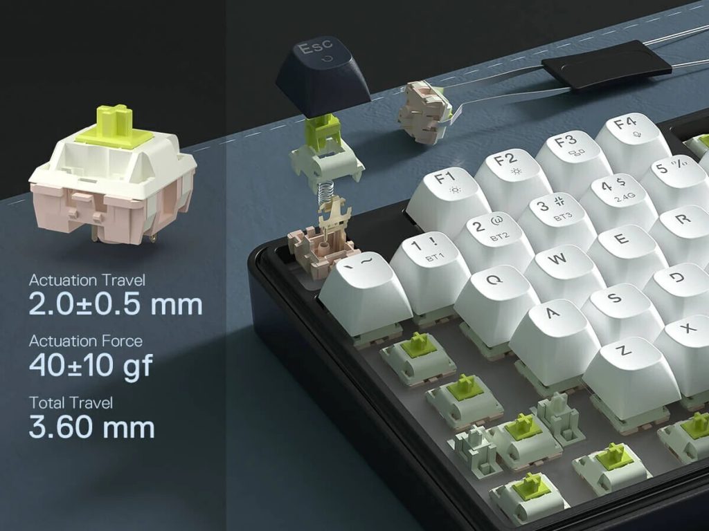 Wyvern K761 Pro hadir dalam dua pilihan warna, yakni kombinasi putih-hijau dan putih-biru. Keduanya dilengkapi pencahayaan RGB tembus cahaya serta keycap PBT berbentuk membulat yang menyerupai tinggi profil OEM. Redragon membekali keyboard ini dengan switch linear Mint Mambo berdaya tekan 40 gf dan jarak aktuasi 3,6 mm. Dukungan hot-swap untuk switch 3-pin dan 5-pin memungkinkan pengguna melakukan kustomisasi dengan mudah. Dari sisi konstruksi, Wyvern K761 Pro menggunakan sistem gasket mount dan peredam suara lima lapis di dalam casing. Daya ditopang baterai berkapasitas 4.000 mAh yang diisi melalui USB-C, cukup untuk penggunaan intensif termasuk dengan efek RGB aktif.