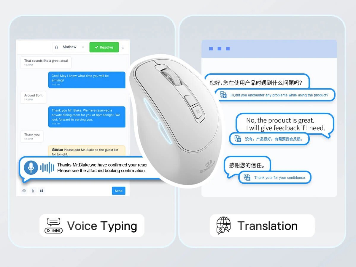 Produk terakhir yang diperkenalkan adalah BM4195, mouse pintar berbasis AI yang ditujukan untuk kebutuhan kantor. Mouse ini mengusung desain ergonomis kompak dengan bentuk asimetris untuk pengguna tangan kanan. Redragon menyematkan sejumlah tombol pintasan yang dapat diarahkan ke layanan berbasis AI, termasuk input suara dan fitur pencarian cerdas. Fungsi-fungsi tersebut dapat dikonfigurasi melalui perangkat lunak bawaan dan pada dasarnya berperan sebagai alternatif tombol khusus asisten AI di sistem operasi.
