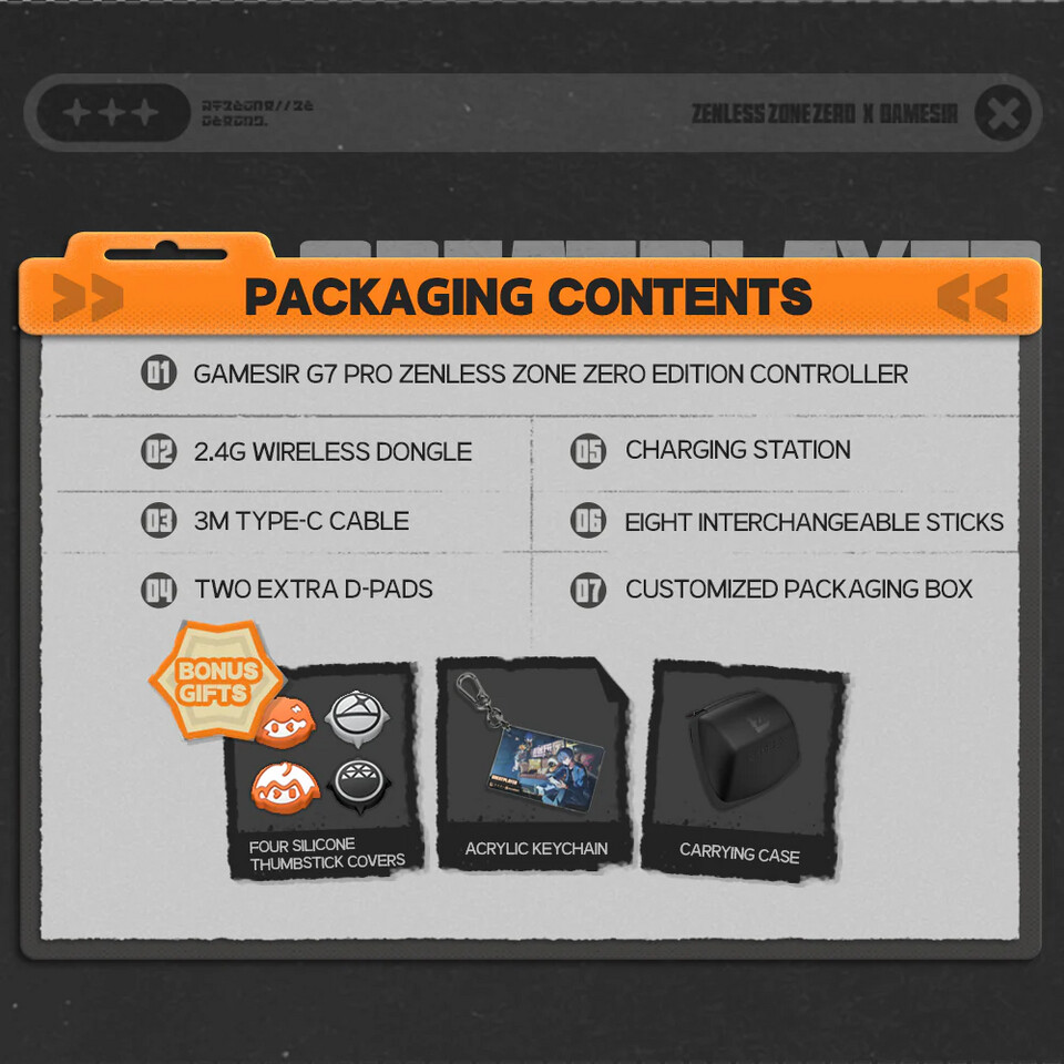 Sebagai nilai tambah, paket penjualan G7 Pro × Zenless Zone Zero Edition turut menyertakan berbagai aksesori eksklusif, seperti faceplate tambahan yang dapat diganti, thumbstick cover silikon bertema Zenless Zone Zero, stick cap cadangan, tas penyimpanan, serta gantungan kunci akrilik edisi khusus. Desain controller sendiri memadukan elemen Bangboo dan Phaethon dengan sentuhan transparan, menciptakan tampilan yang khas dan selaras dengan dunia New Eridu.