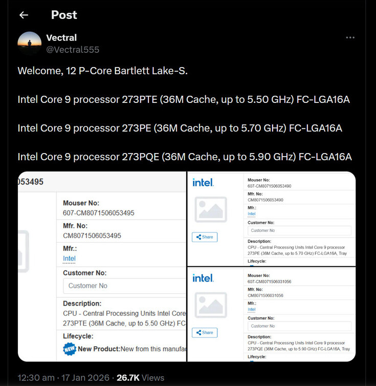 Munculnya listing distributor ini memperkuat spekulasi bahwa Intel tengah menyiapkan peluncuran prosesor Bartlett Lake-S dalam waktu dekat, kemungkinan di bawah skema penamaan Core Series 2. Informasi ini sejalan dengan bocoran lain yang beredar beberapa hari sebelumnya, yang menyebutkan deretan model Core 5, Core 7, hingga Core 9 dengan spesifikasi awal.