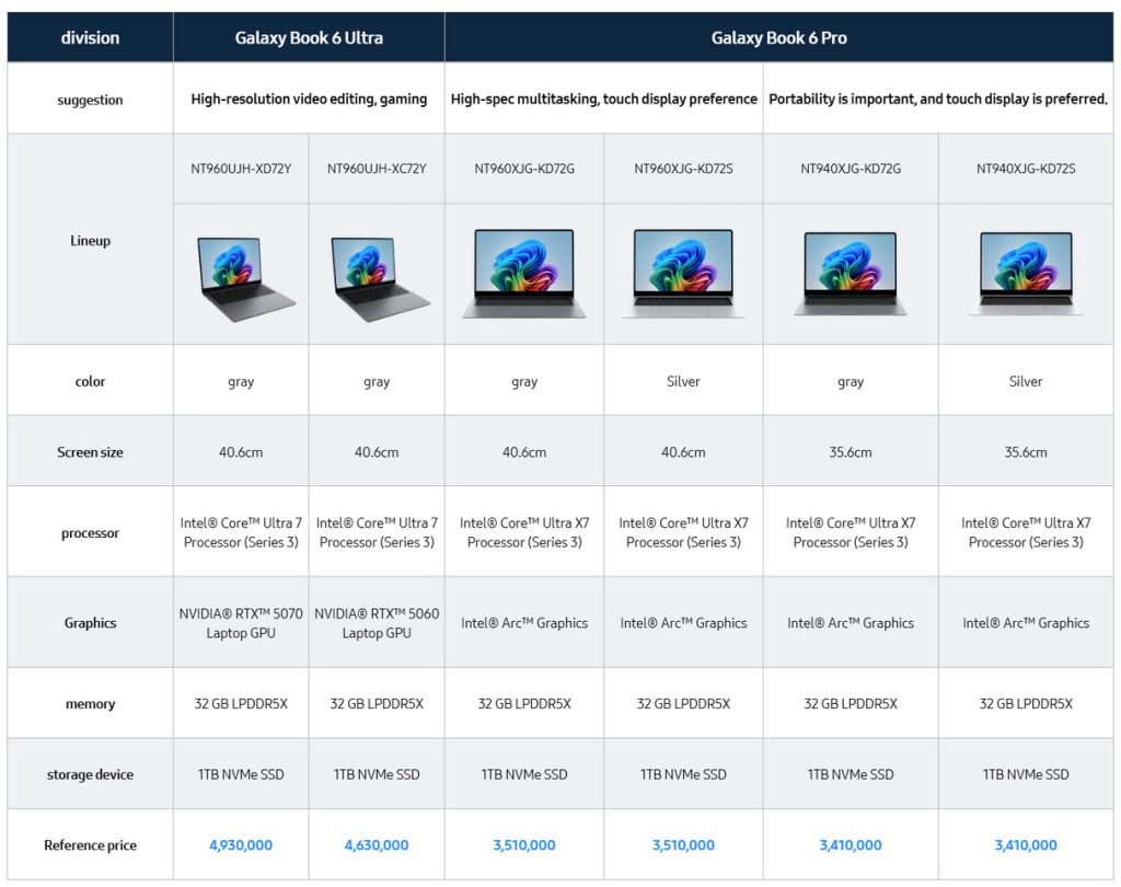 Di puncak lini produk, Galaxy Book6 Ultra dipasarkan dengan harga 4.930.000 won Korea, atau sekitar 3.350 dolar AS. Model ini mempertahankan kapasitas memori dan penyimpanan yang sama dengan varian Pro, namun dibekali GPU diskret NVIDIA GeForce RTX 5070. Perbedaan utama lainnya terletak pada ukuran layar dan kemampuan grafis yang lebih tinggi.
