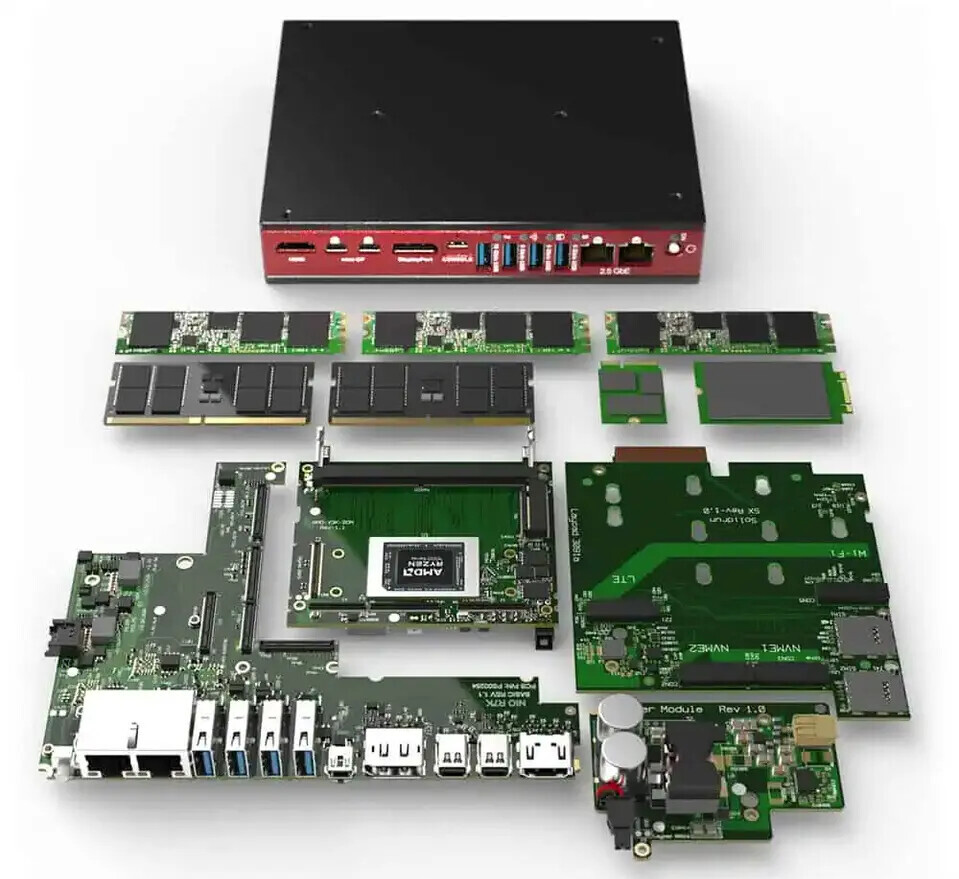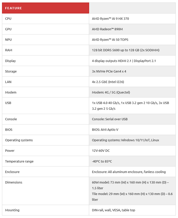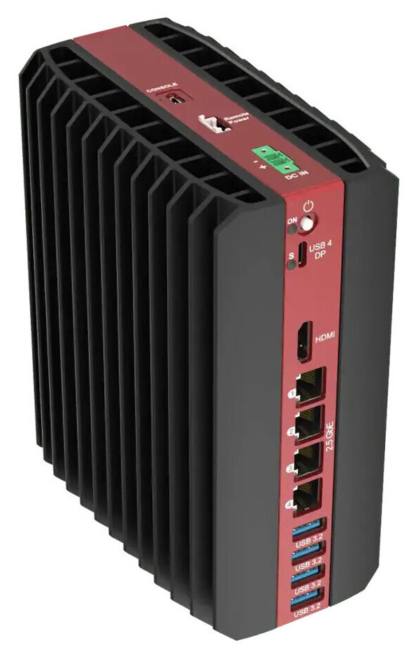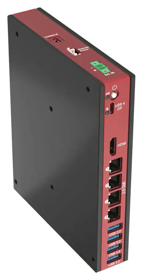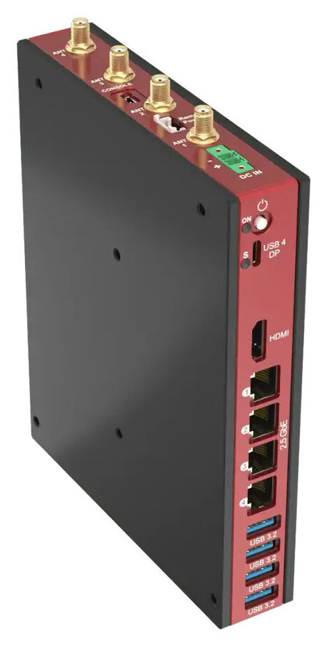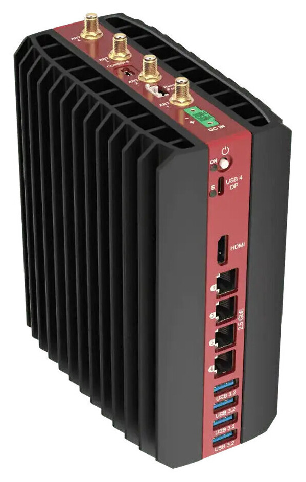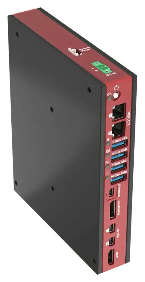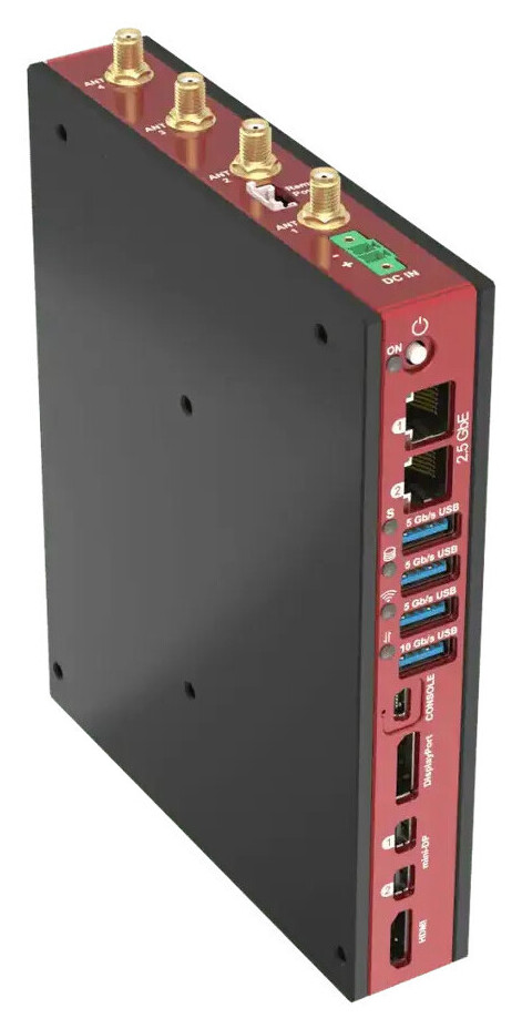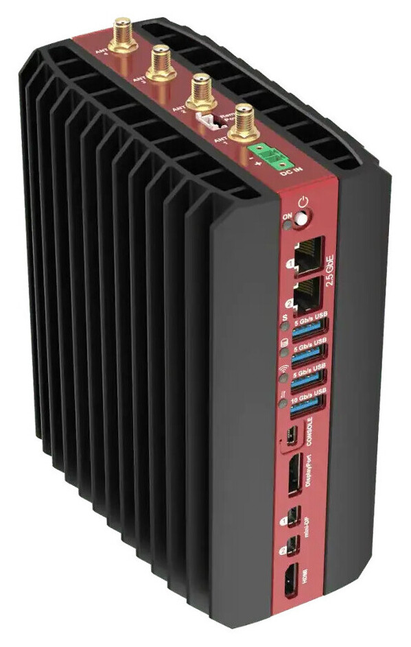 Pilihan I/O juga komprehensif, mencakup hingga empat output display (HDMI 2.1 + 3x DisplayPort 2.1), hingga empat port Ethernet 2,5 Gbps berbasis Intel I226, opsi modem LTE, USB4 Type-C, empat port USB 3.2, serta port konsol. Seluruh I/O ditempatkan pada satu sisi untuk memudahkan integrasi sistem.