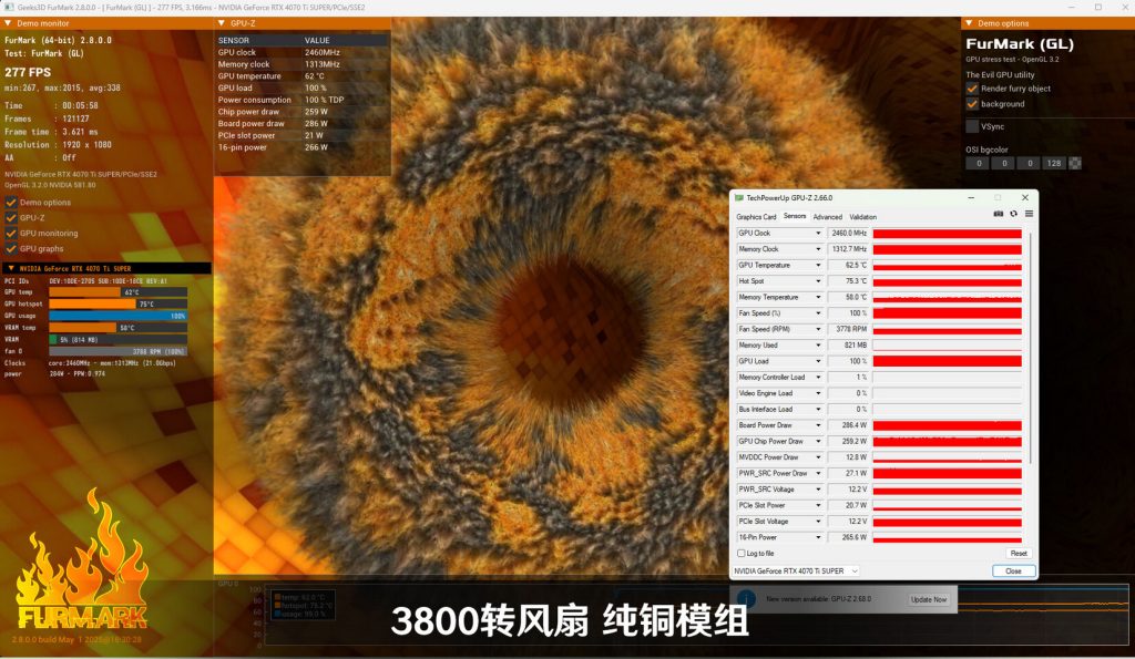Dalam pengujian internal, prototipe GeForce RTX 4070 Ti SUPER versi Sakura Snow X mencapai batas referensi 285 W sesuai spesifikasi NVIDIA, seraya memenuhi target performa papan standar. Tantangan utama berada pada pendinginan: Zephyr mengandalkan satu kipas dengan modul heatsink tertutup yang ringkas.