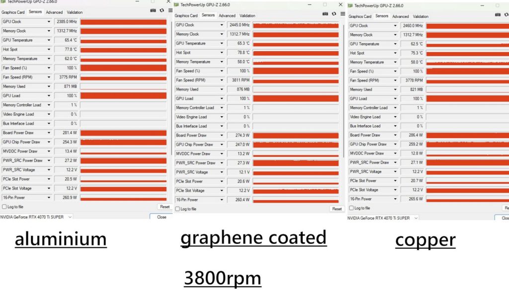Tim инженер Zephyr menguji dua kecepatan kipas—3000 RPM dan 3800 RPM—serta tiga opsi material finstack. Hasilnya, modul tembaga murni mencatat performa termal terbaik dalam kondisi terbuka, meski berimbas pada biaya produksi yang lebih tinggi. Opsi aluminium berlapis graphene menunjukkan performa yang mendekati aluminium polos, namun dengan tampilan hitam yang dinilai memberi kesan lebih premium.