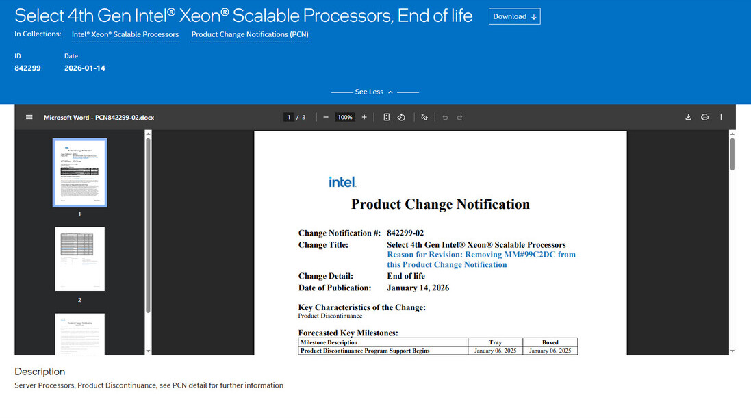 Di segmen server, Intel turut mengonfirmasi penghentian bertahap untuk prosesor 4th Gen Xeon Scalable Sapphire Rapids melalui dokumen PCN tertanggal 14 Januari 2026 bernomor 842299-02. Dalam dokumen tersebut, tercatat sebanyak 17 SKU Xeon Sapphire Rapids, baik versi boxed maupun tray, akan memasuki fase penghentian produksi. Menariknya, satu model Xeon Gold 6414U disebut masih dipertahankan dari daftar tersebut.