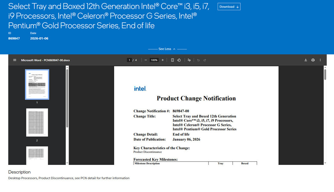 Intel secara resmi mengumumkan rencana penghentian produksi untuk sejumlah prosesor generasi lama melalui dua Product Change Notification (PCN) yang dirilis pada awal Januari 2026. Keputusan ini mencakup sebagian prosesor desktop 12th Gen Core berbasis Alder Lake-S serta beberapa SKU prosesor server 4th Gen Xeon Scalable dengan nama kode Sapphire Rapids.