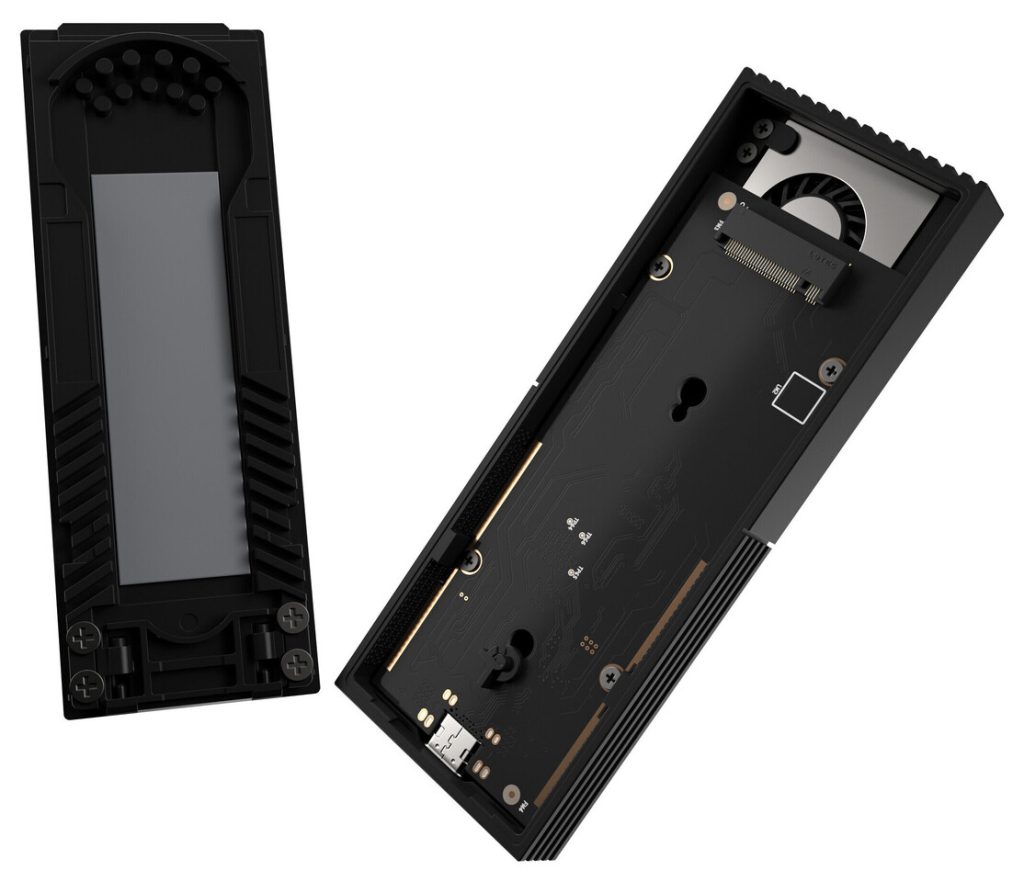 - Kipas Pintar 4 Tingkat: Enklosur ini menanamkan kipas pendingin pintar dengan empat tingkat kecepatan dan bantalan termal (thermal pad) bawaan. Sistem ini secara efisien mengelola panas selama sesi kerja yang menuntut.