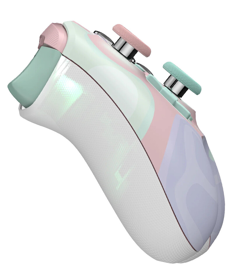 Cangkang pengontrol ini mengusung desain tembus pandang (translucent) yang memadukan warna merah muda, biru, dan lavender yang lembut menjadi satu kesatuan estetika yang apik.