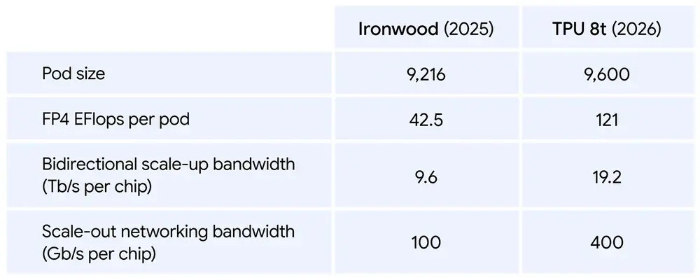 - Skala Masif: Satu superpod TPU 8t kini dapat menskalakan hingga 9.600 cip dan dua petabyte memori bandwidth tinggi bersama, memberikan 121 ExaFlops komputasi.