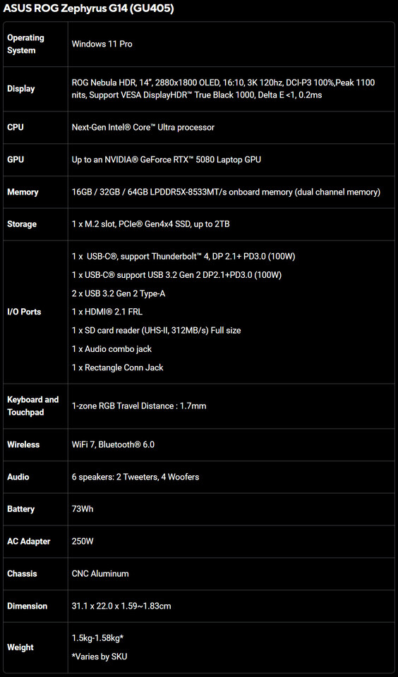 Zephyrus G16 hadir dalam tiga varian GPU yang berbeda, namun tetap mempertahankan spesifikasi layar yang sama: panel OLED 16 inci 2560×1600p dengan refresh rate super mulus 240 Hz, cakupan DCI-P3 100%, dan validasi Pantone. Semuanya juga diotaki oleh CPU Intel Core Ultra 9 386H.